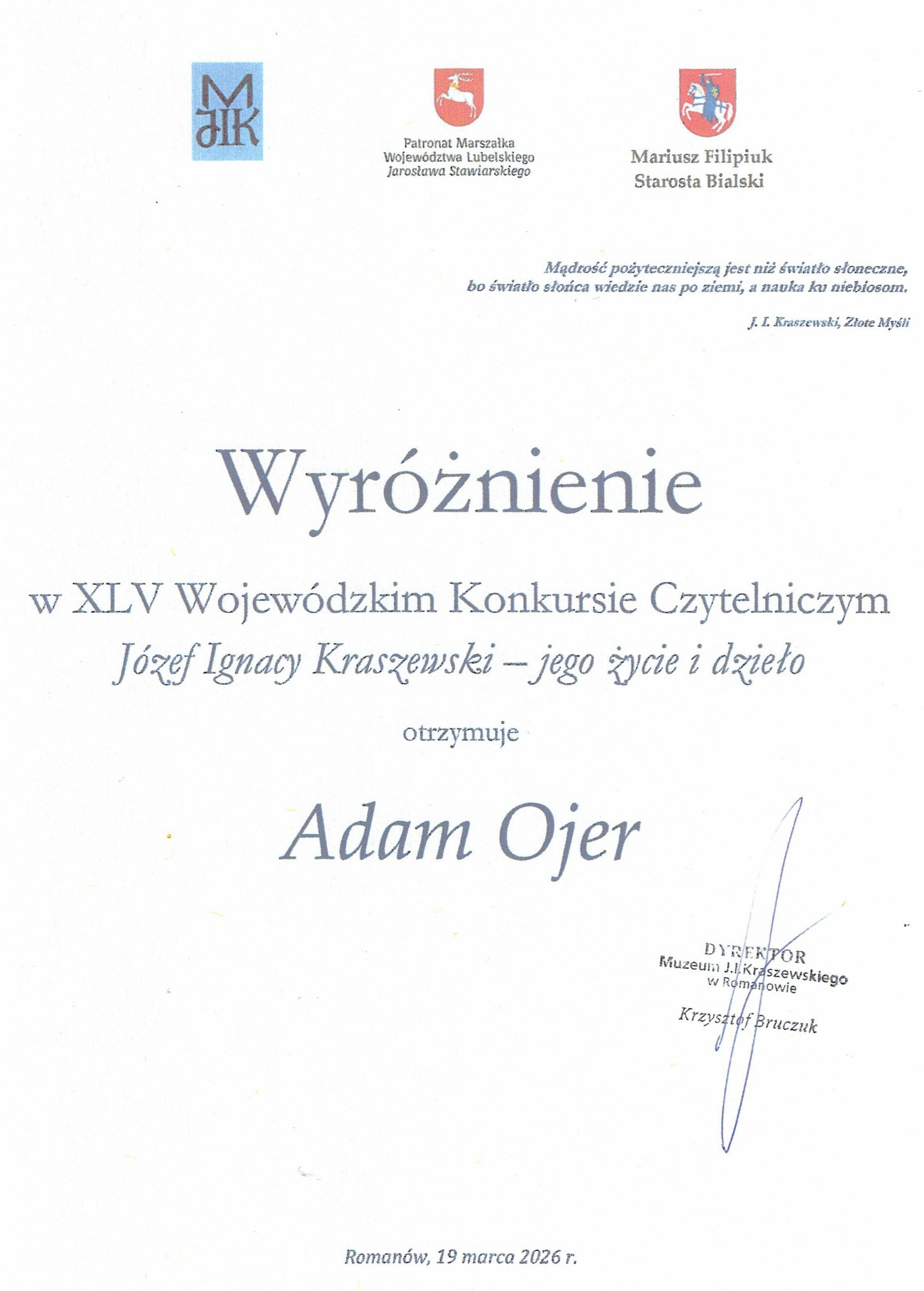 II miejsce Karola Kaźniuka w Konkursie Literackim na opowiadanie pt. „Droga do niepodległości”
