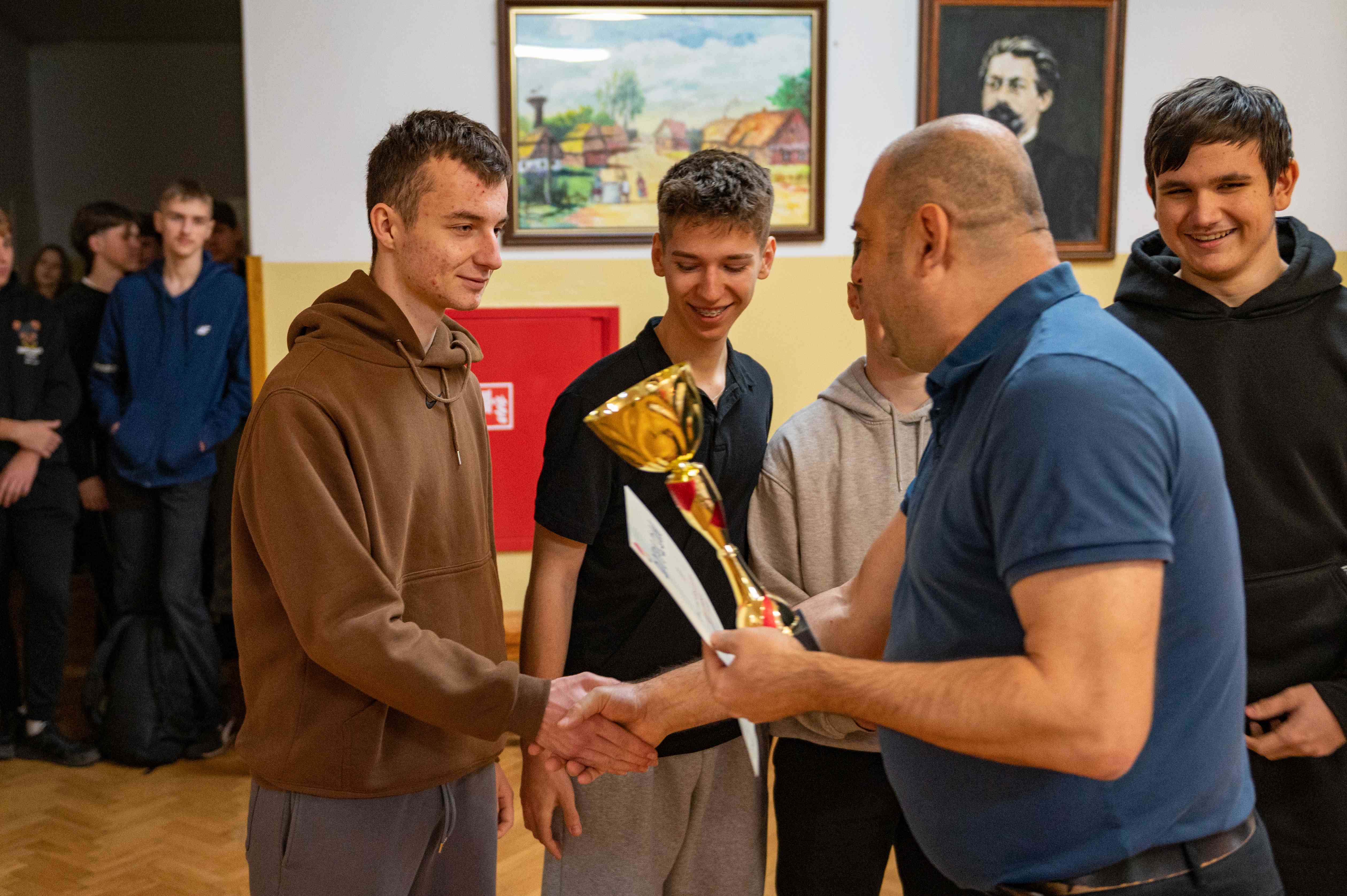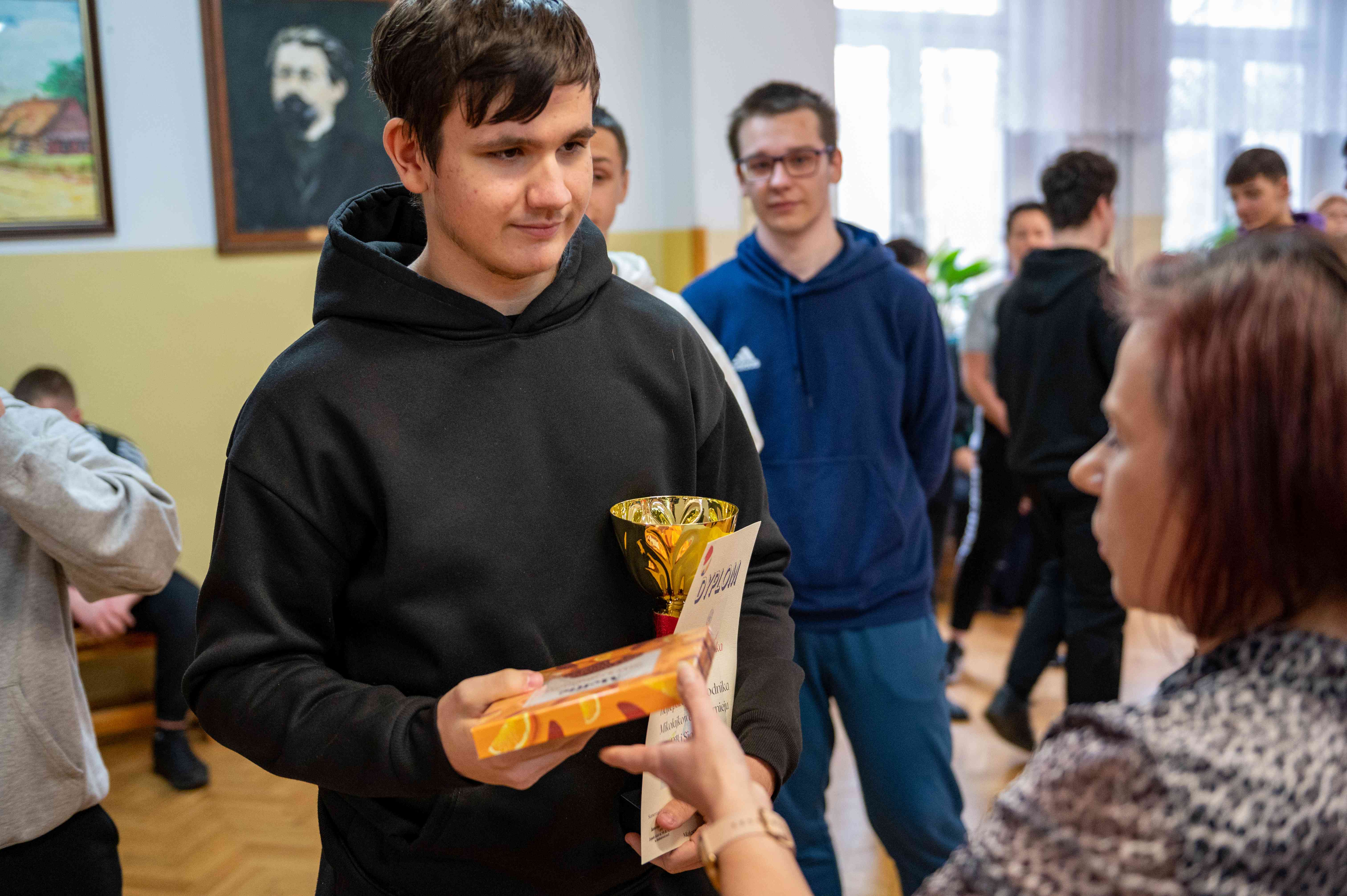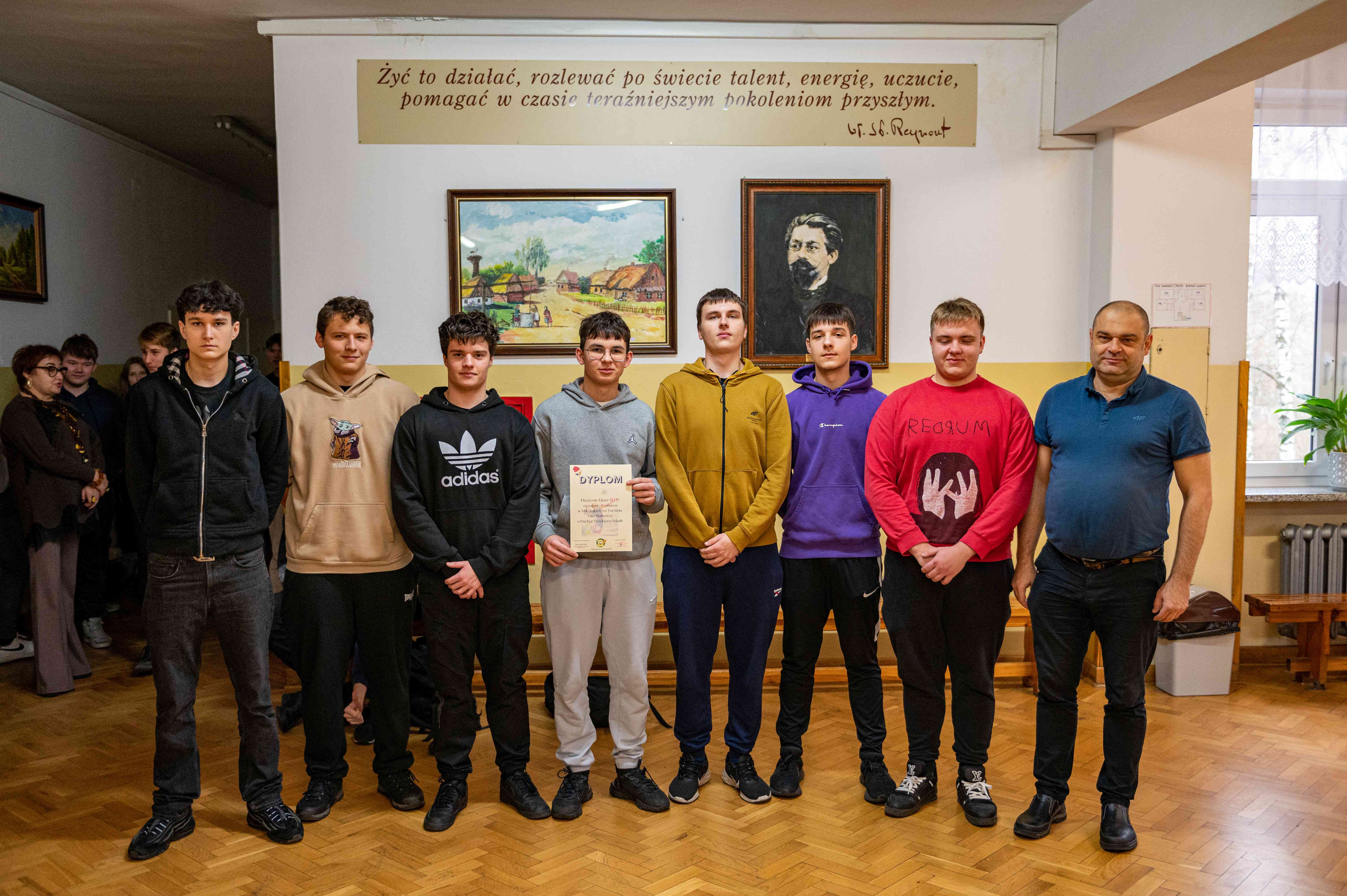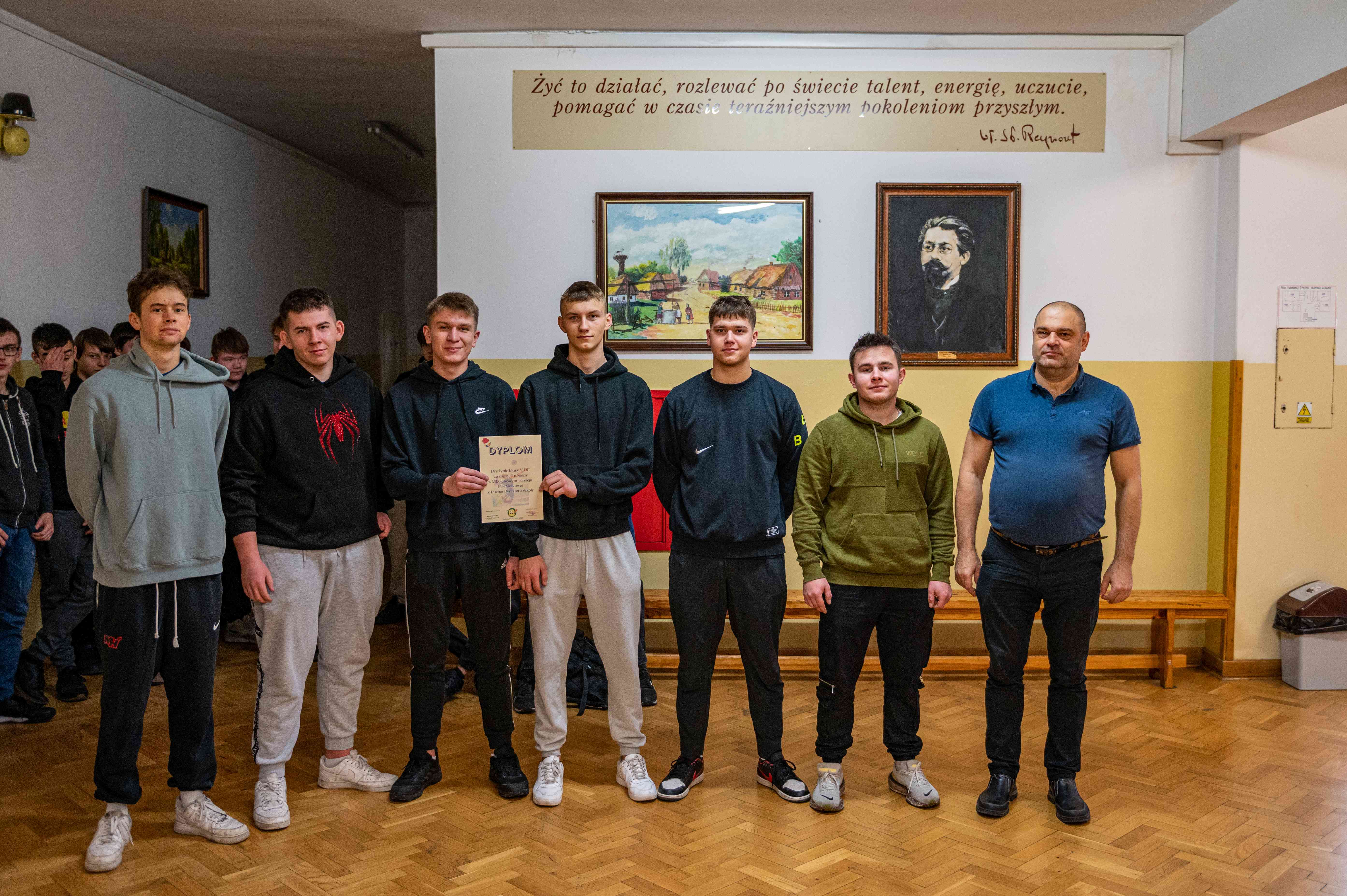 Nagrody, dyplomy i puchar siatkarzom wręczył dyrektor naszej szkoły - Pan Robert Wieczorek.