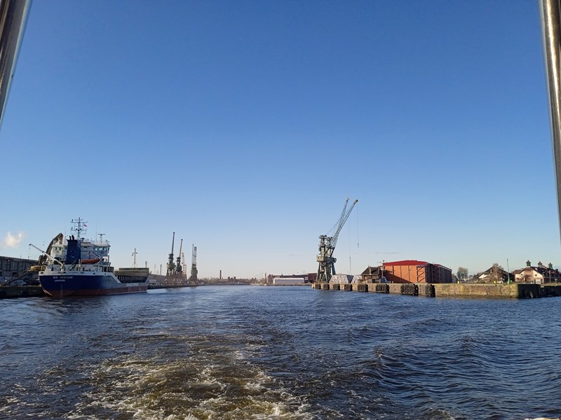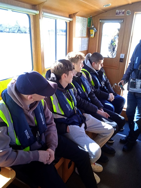 Kolejnym krokiem było przejście przez kontrolę bezpieczeństwa, wstęp na teren portu mają tylko osoby, które posiadają odpowiednie przepustki. Tutaj ukłony w stronę Zarządu Morskich Portów Szczecin i Świnoujście S.A., który takie przepustki wystawił naszej delegacji (nie każdej szkole takie przepustki są wydawane). Następnie mieliśmy okazję odbycia rejsu statkiem Hydrograf-4, służącym do monitorowania głębokości torów wodnych, aby jednostki wpływające do portu nie osiadły na mieliźnie. Rejs rozpoczął się od instruktażu bezpiecznego zachowania na statku i założenia kapoków. Oczywiście jak na prawdziwą lekcję przystało, rejs rozpoczął się od dzwonka oznajmiającego odbicie od brzegu. W tym czasie uczniowie zapoznali się z infrastrukturą nadbrzeżną portu, urządzeniami technicznymi transportu wewnętrznego służącymi do załadunku i wyładunku towarów oraz statkami przebywającymi aktualnie w porcie. W związku z tym, że w porcie obsługiwane są różnego rodzaju ładunki, jest on wyposażony w budowle magazynowe przystosowane do ich przechowywania, takie jak zbiorniki na paliwa ciekłe i gazowe, hale magazynowe, place składowe, czy elewator – największy w Polsce – służący do przechowywania zboża. Nad ruchem w porcie czuwa kapitanat, którego siedziba nie mogła umknąć uwadze uważnie obserwujących otoczenie uczniów. Z pokładu młodzież mogła również obejrzeć statki budowane i remontowane w Stoczni Szczecińskiej oraz wyposażenie w urządzenia transportu wewnętrznego takie jak suwnice bramowe, żurawie stoczniowe.