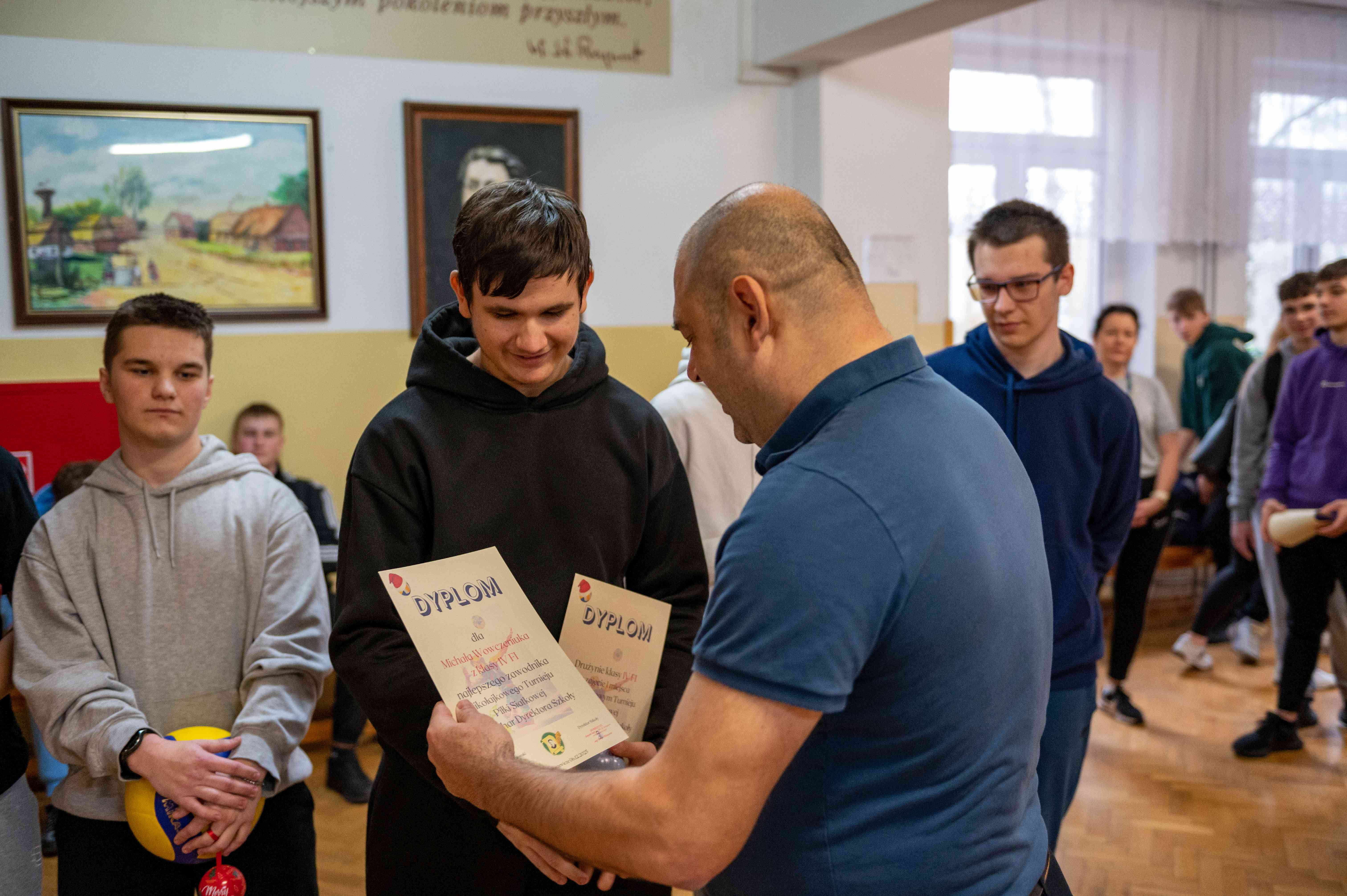 Nagrody, dyplomy i puchar siatkarzom wręczył dyrektor naszej szkoły - Pan Robert Wieczorek.