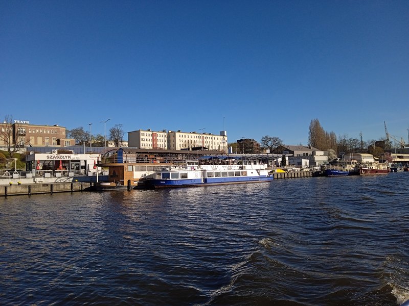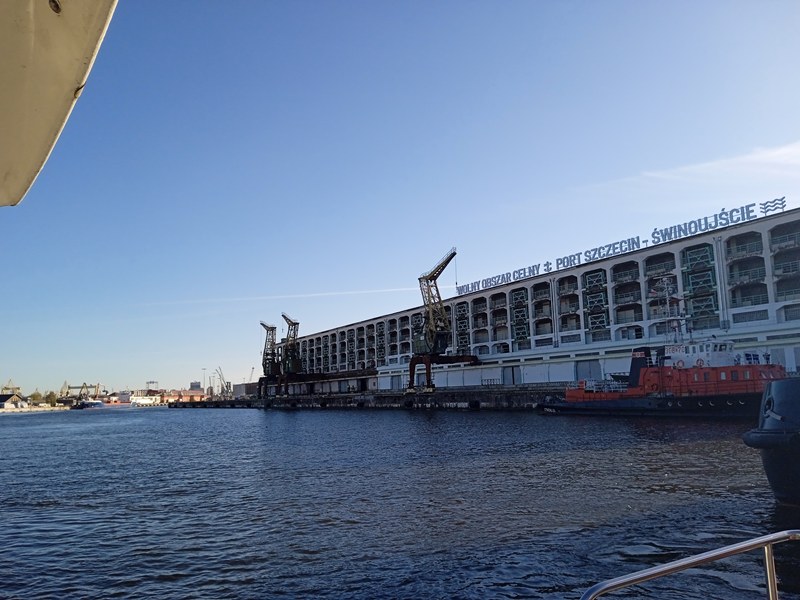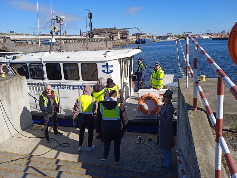 Kolejnym krokiem było przejście przez kontrolę bezpieczeństwa, wstęp na teren portu mają tylko osoby, które posiadają odpowiednie przepustki. Tutaj ukłony w stronę Zarządu Morskich Portów Szczecin i Świnoujście S.A., który takie przepustki wystawił naszej delegacji (nie każdej szkole takie przepustki są wydawane). Następnie mieliśmy okazję odbycia rejsu statkiem Hydrograf-4, służącym do monitorowania głębokości torów wodnych, aby jednostki wpływające do portu nie osiadły na mieliźnie. Rejs rozpoczął się od instruktażu bezpiecznego zachowania na statku i założenia kapoków. Oczywiście jak na prawdziwą lekcję przystało, rejs rozpoczął się od dzwonka oznajmiającego odbicie od brzegu. W tym czasie uczniowie zapoznali się z infrastrukturą nadbrzeżną portu, urządzeniami technicznymi transportu wewnętrznego służącymi do załadunku i wyładunku towarów oraz statkami przebywającymi aktualnie w porcie. W związku z tym, że w porcie obsługiwane są różnego rodzaju ładunki, jest on wyposażony w budowle magazynowe przystosowane do ich przechowywania, takie jak zbiorniki na paliwa ciekłe i gazowe, hale magazynowe, place składowe, czy elewator – największy w Polsce – służący do przechowywania zboża. Nad ruchem w porcie czuwa kapitanat, którego siedziba nie mogła umknąć uwadze uważnie obserwujących otoczenie uczniów. Z pokładu młodzież mogła również obejrzeć statki budowane i remontowane w Stoczni Szczecińskiej oraz wyposażenie w urządzenia transportu wewnętrznego takie jak suwnice bramowe, żurawie stoczniowe.