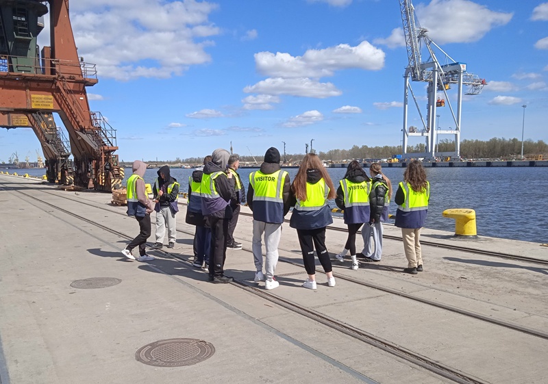 Praktyki rozpoczęliśmy w gmachu Zarządu Morskich Portów Szczecin i Świnoujście S.A., gdzie zostaliśmy miło przyjęci przez pracowników. Po poczęstunku uczniowie zostali zapoznani z prezentacją dotyczącą obszarów działalności portu w Szczecinie i Świnoujściu, strategii rozwoju – rozbudowa infrastruktury w celu przyjmowania coraz większych jednostek pływających, wdrażania nowych technologii dotyczących między innymi transportów intermodalnych w celu sprostania wymaganiom współczesnego transportu morskiego. Działalność portów to nie tylko obsługa ładunków masowych, drobnicowych, wielkogabarytowych i paliw płynnych, lecz także działalność związaną z obsługą ruchu pasażerskiego szczególnie w porcie Świnoujście. Po prezentacji przyszedł czas na zapoznanie się z portem. Bezpieczeństwo to rzecz nadrzędna, dlatego uczniowie i opiekunowie zostali wyposażeni w kamizelki odblaskowe.
