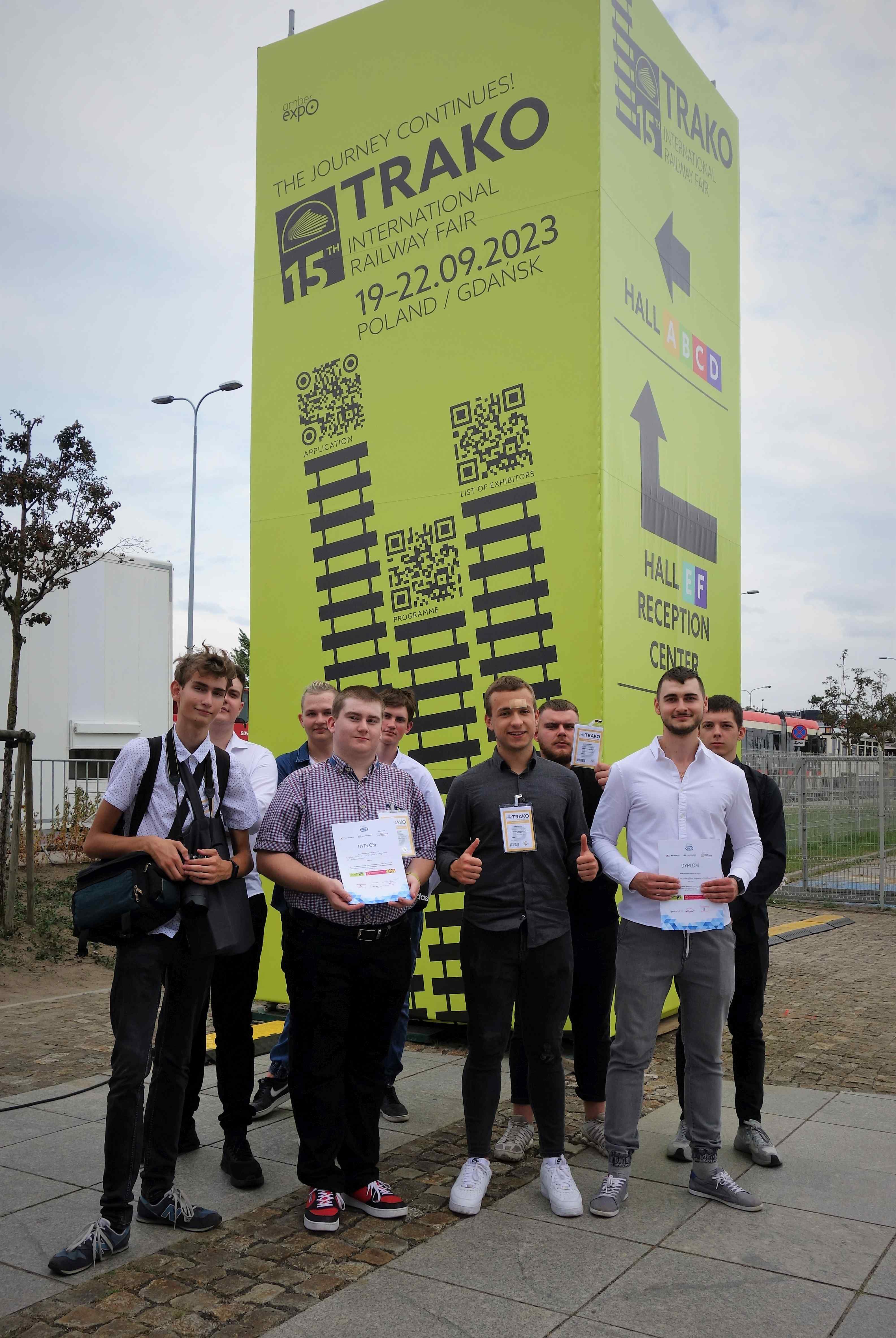 W dniach 21-22 września dziewięciu uczniów naszej szkoły uczestniczyło w jednym z najważniejszych wydarzeń branży kolejowej, czyli w 15. Międzynarodowych Targach Kolejowych TRAKO 2023! Jest to cykliczna impreza dedykowana instytucjom, pracownikom, a także kandydatom do pracy na kolei, w tym także i uczniom oraz studentom kierunków kolejowych. Z tego powodu ostatni dzień targowy od kilku lat jest Dniem Edukacji i Kariery. Nasi uczniowie nie mogli zatem nie pojawić się na tej znakomitej branżowej imprezie. Pod opieką Pani Małgorzaty Trębickiej-Żuk wybrali się na to wydarzenie aż do Gdańska. Godne uwagi jest to, że wzięli udział w krajowych – ogólnopolskich drużynowych konkursach umiejętności i wiedzy kolejowej, a dokładniej w konkursach: „Maszynista – zawód z przyszłością” oraz „Transport kolejowy moją pasją”. I stała się rzecz absolutnie niesamowita! Absolutnie bez precedensu! Nasze drużyny okazały się… absolutnie bezkonkurencyjne! Szczególnie Jakub Chwesiuk (V DC), Dariusz Mincewicz (V DI) oraz Bartłomiej Zajko (V DC), którzy w konkursie „Transport kolejowy moją pasją” w doskonałym stylu zajęli 1. miejsce, pokonując jednocześnie drużyny z 17. innych szkół kolejowych z całej Polski!